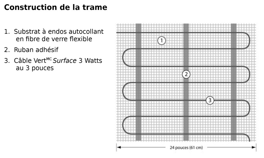Comme il suffit de la dérouler, la Trame Câble Vert est parfaite pour les pièces carrées ou rectangulaires sans obstacles. Composée d’un câble 3W disposé à un espacement de 7,6 cm (3 po) sur un substrat autocollant, elle a une largeur standard de 61 cm (24 pouces) et est offerte en plusieurs longueurs pour assurer une couverture parfaite à tout coup.